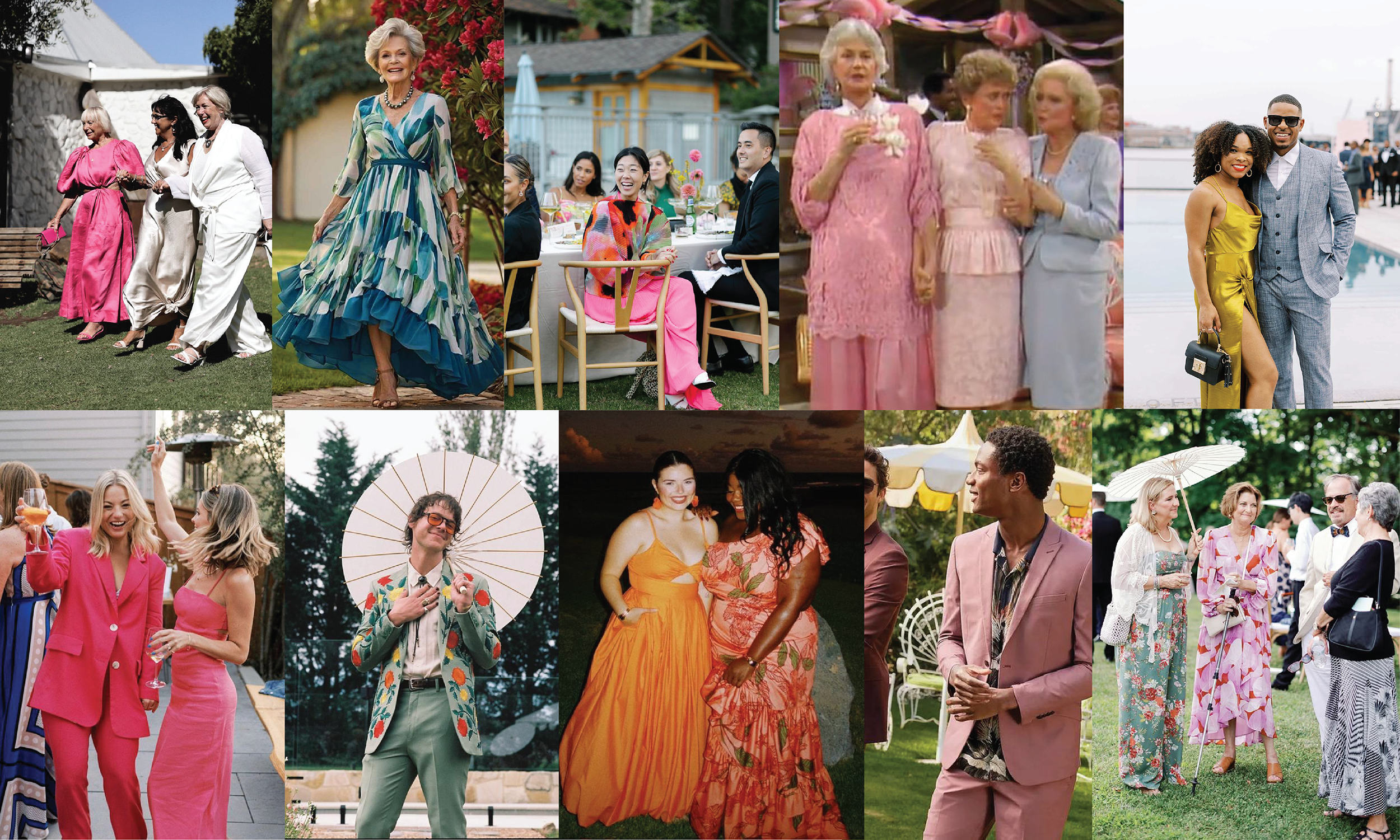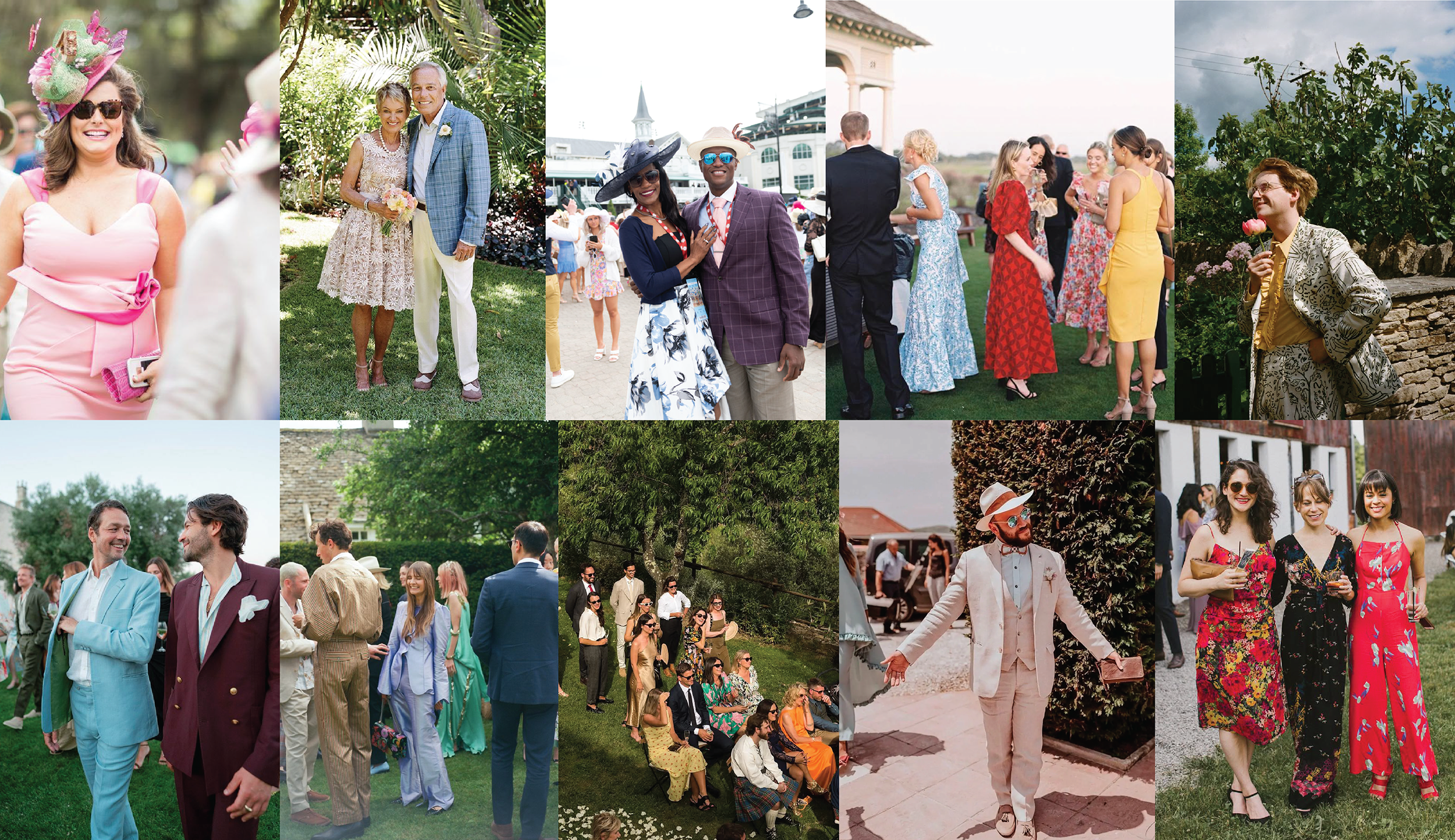"Festive" - We encourage our guests to let their personal style shine through. Feel free to experiment with colors, textures, prints, and accessories. No color is off limits - including white - because there is no bride to worry about outshining! Just have fun and look fabulous.